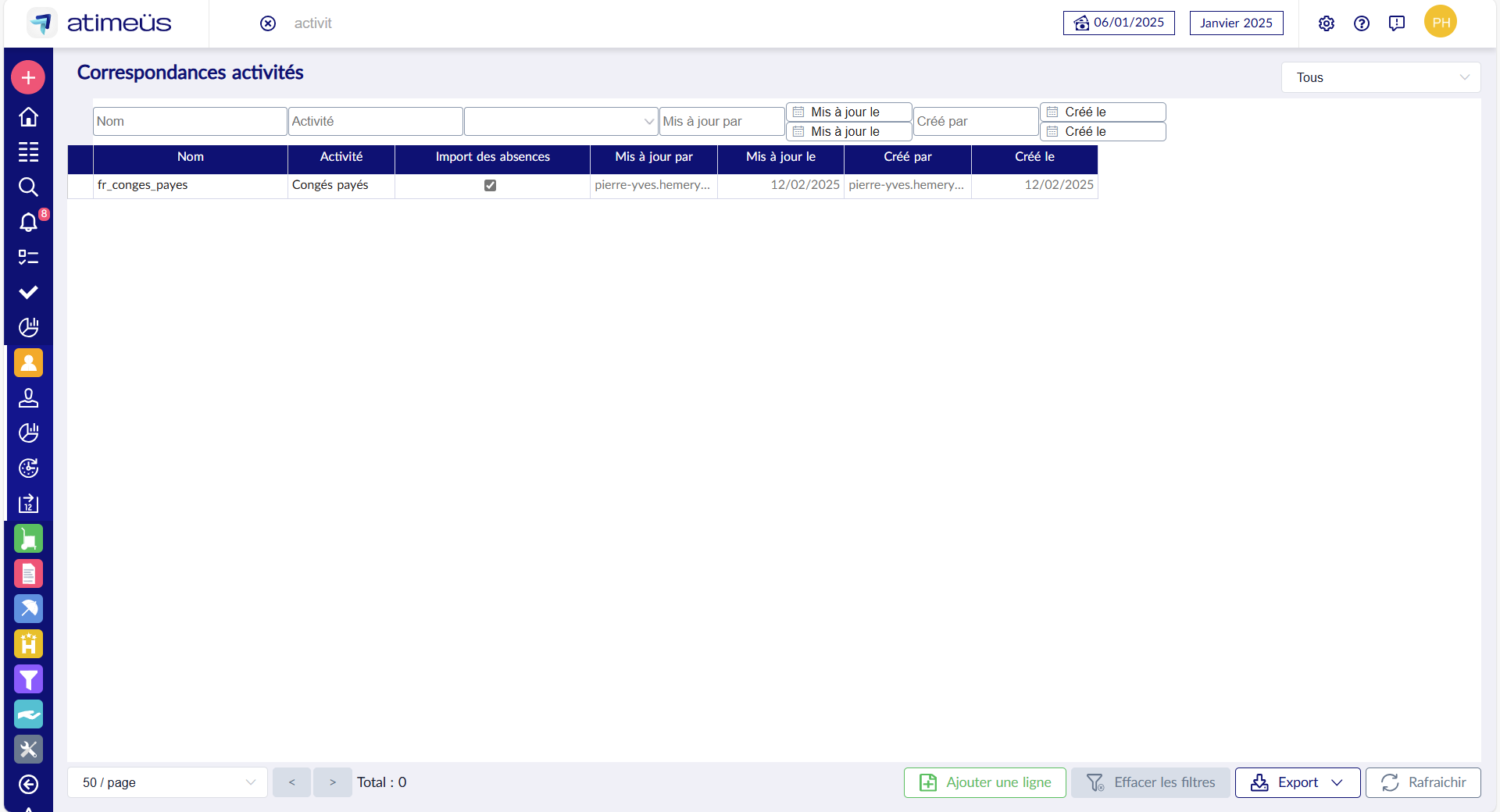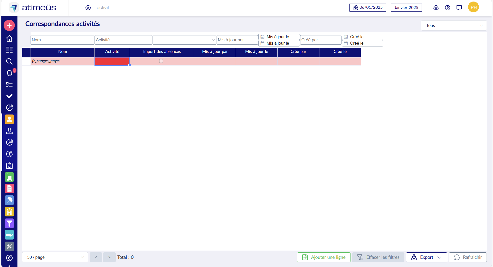 Afin d'ajouter les absences Lucca dans le CRA des collaborateurs, il reste à définir l'activité Atimeüs à utiliser pour chaque type d'absence venant de Lucca.