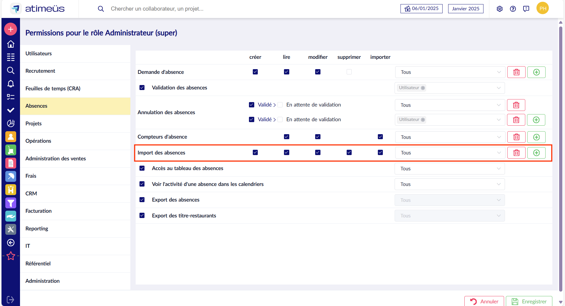 - Ajouter les droits Absences > Import des absences aux rôles concernés