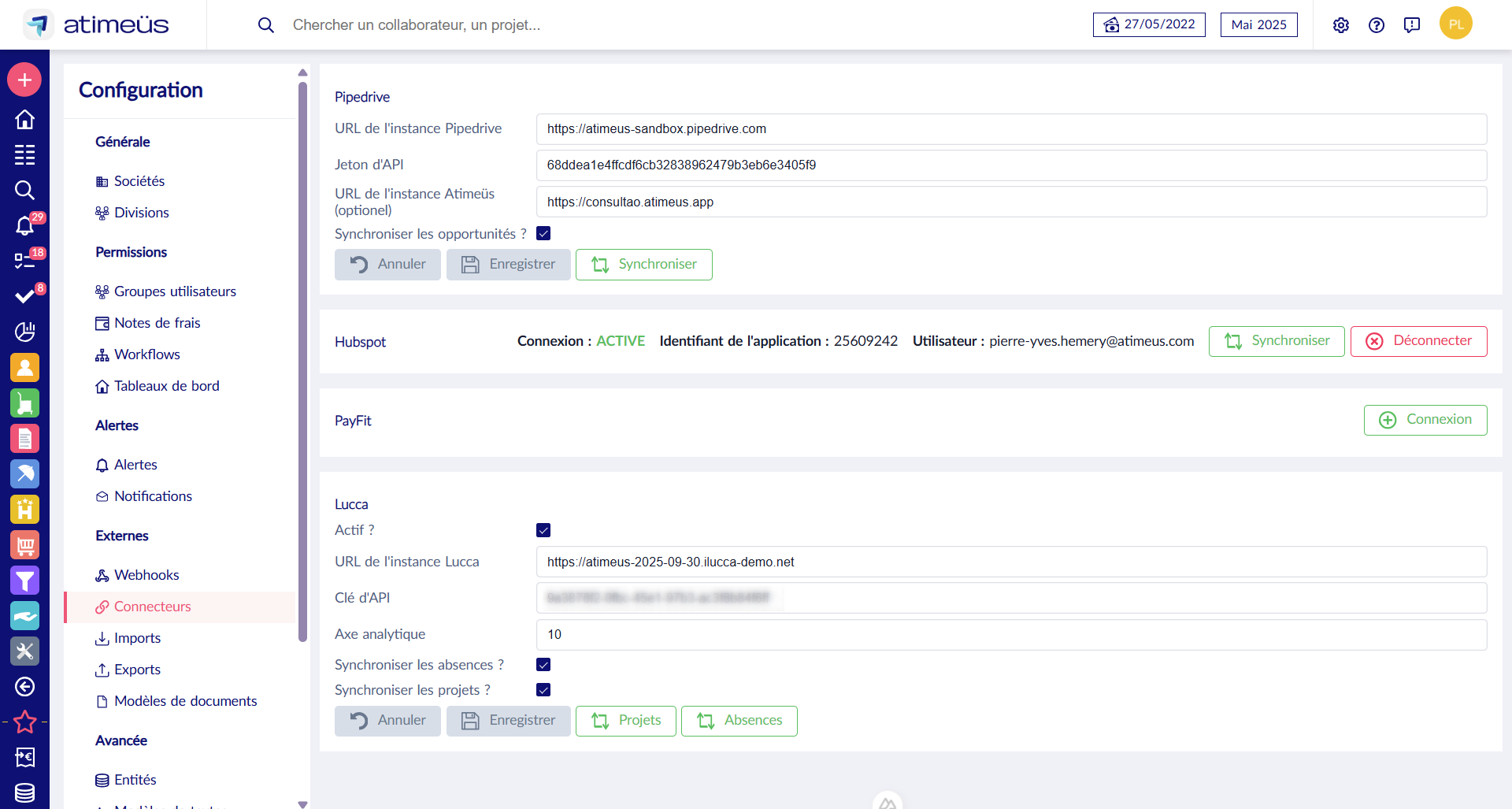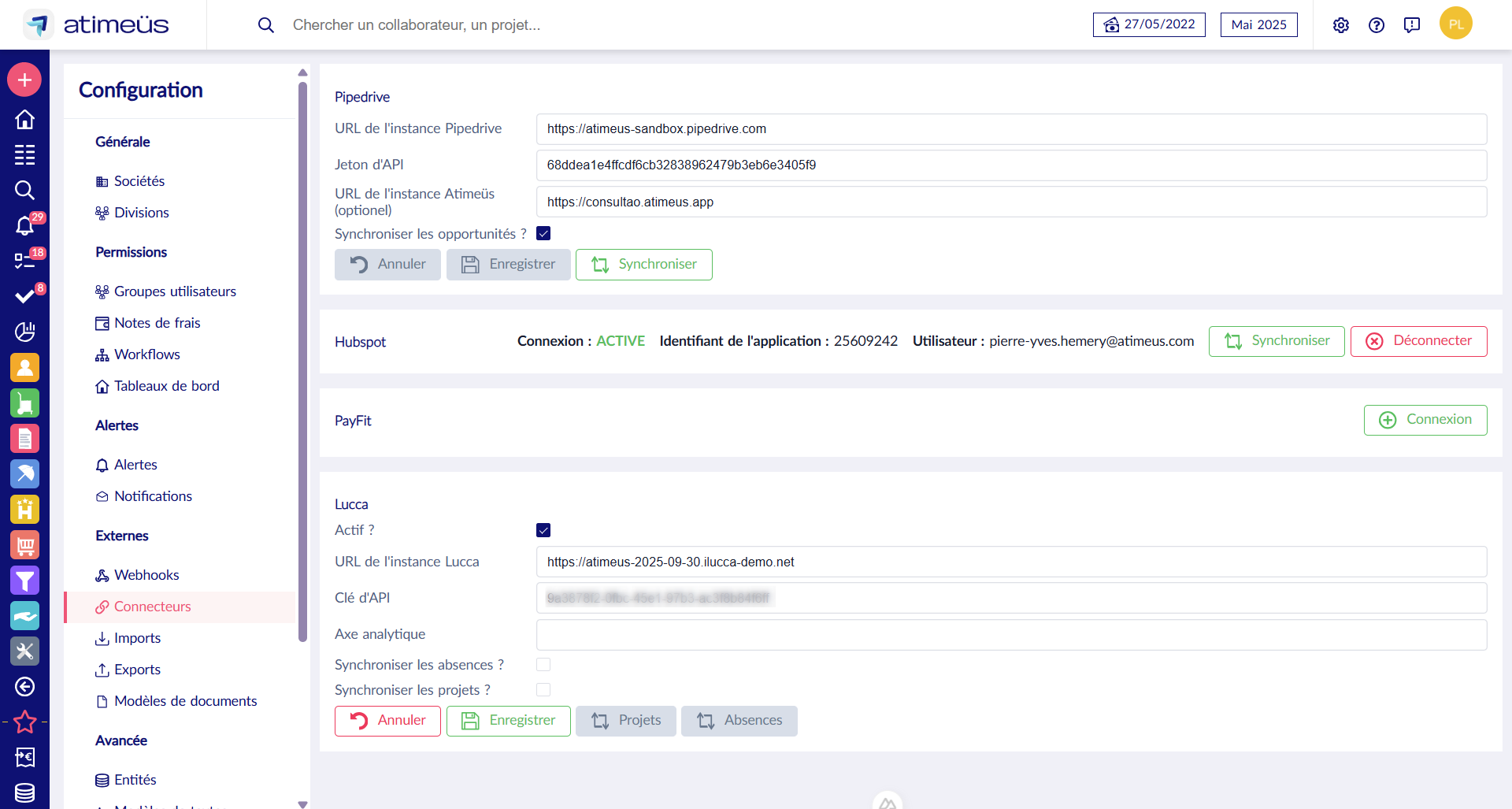 - Ouvrir la Configuration > Externes > Connecteurs > Lucca