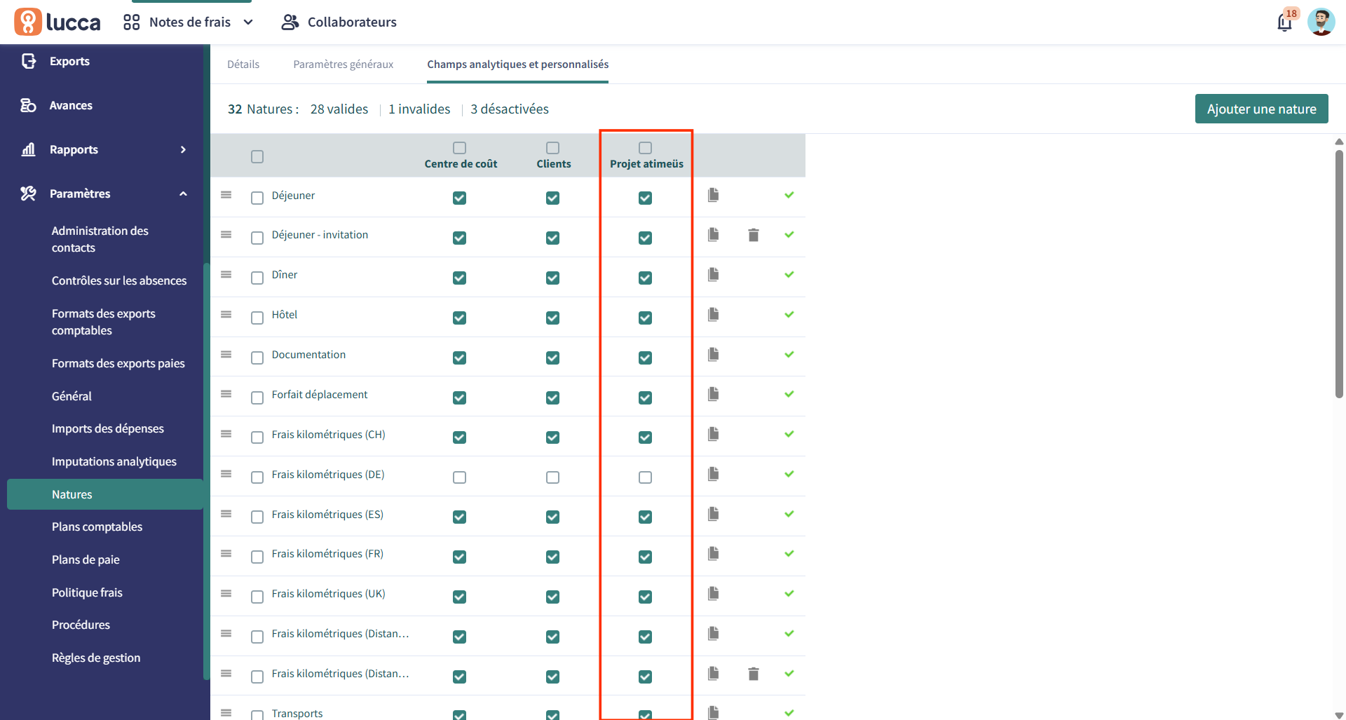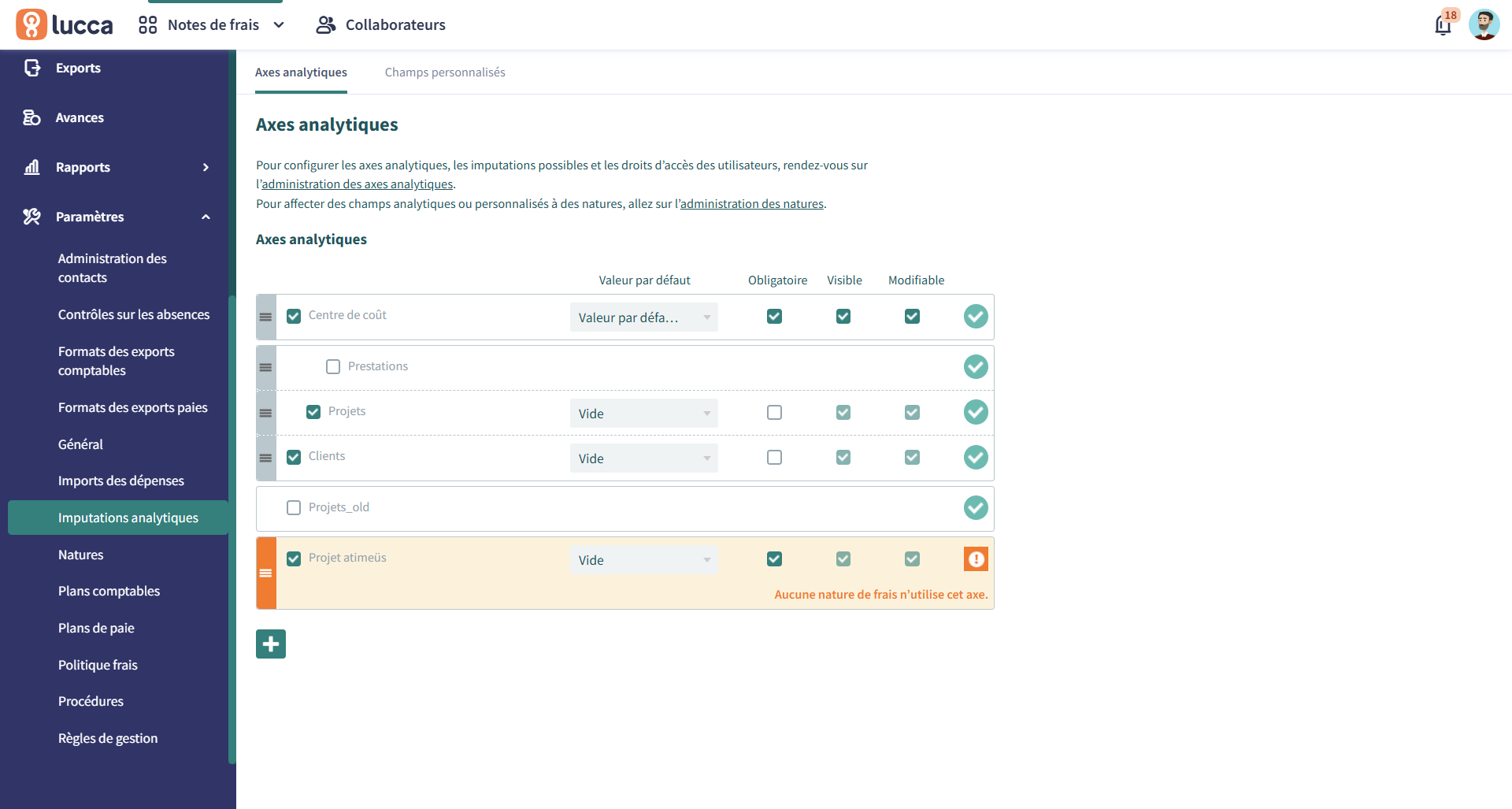 - Ouvrir les Paramètres > Nature > Champs analytiques