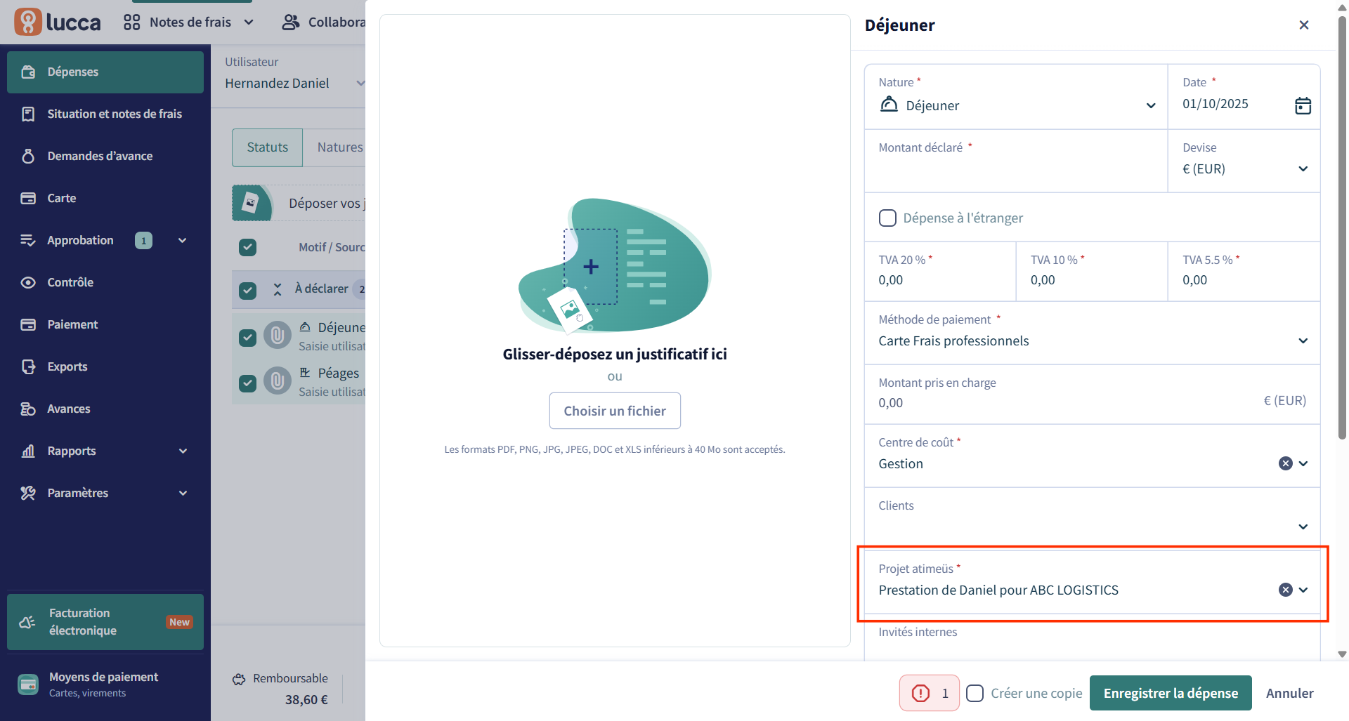 - Associer une dépense avec un projet Atimeüs lors de la saisie d'une note de frais dans Lucca