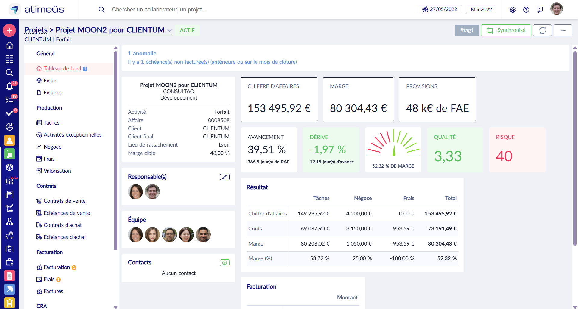 Elle est affichée en montant et en %, et l'indicateur compare la marge réalisée à la marge cible du projet.