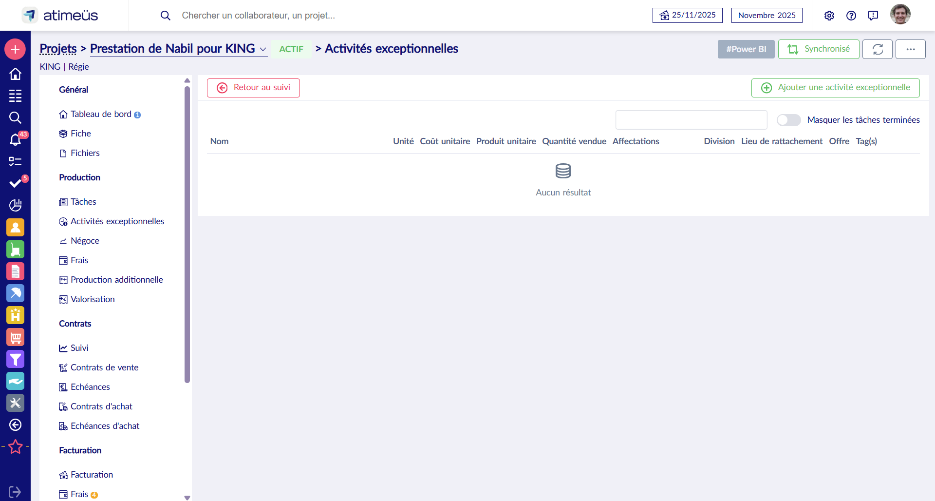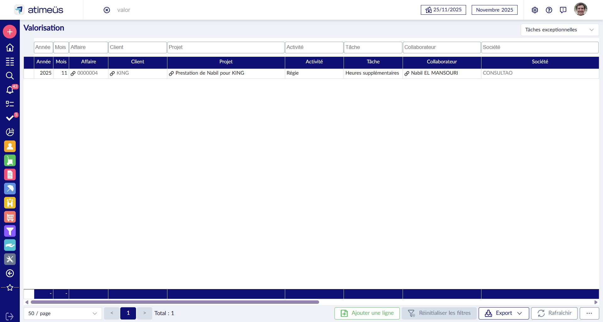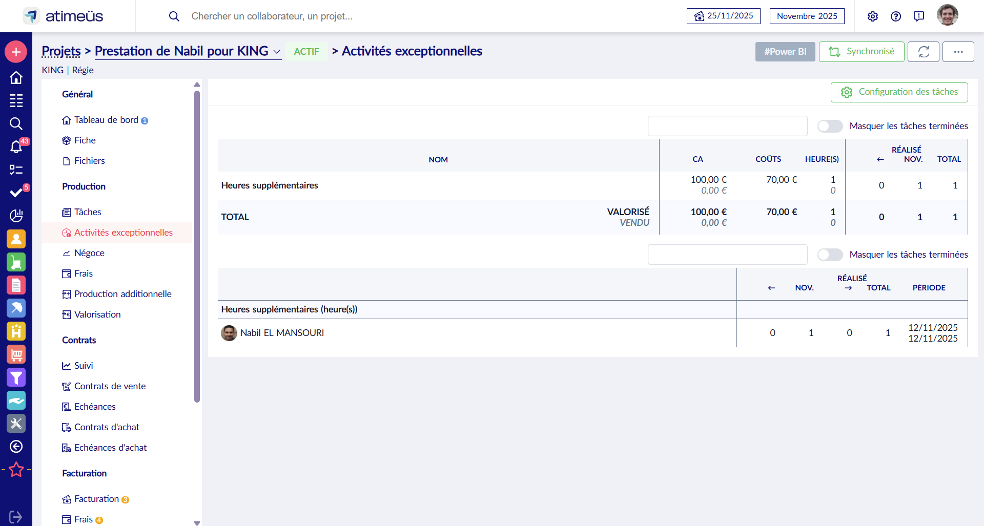 Outre l'écran de suivi sur la fiche Projet, une vue "Tâches exceptionnelles" sur la liste de la valorisation globale permet de suivre et d'exporter toutes les imputations à traiter en paie.